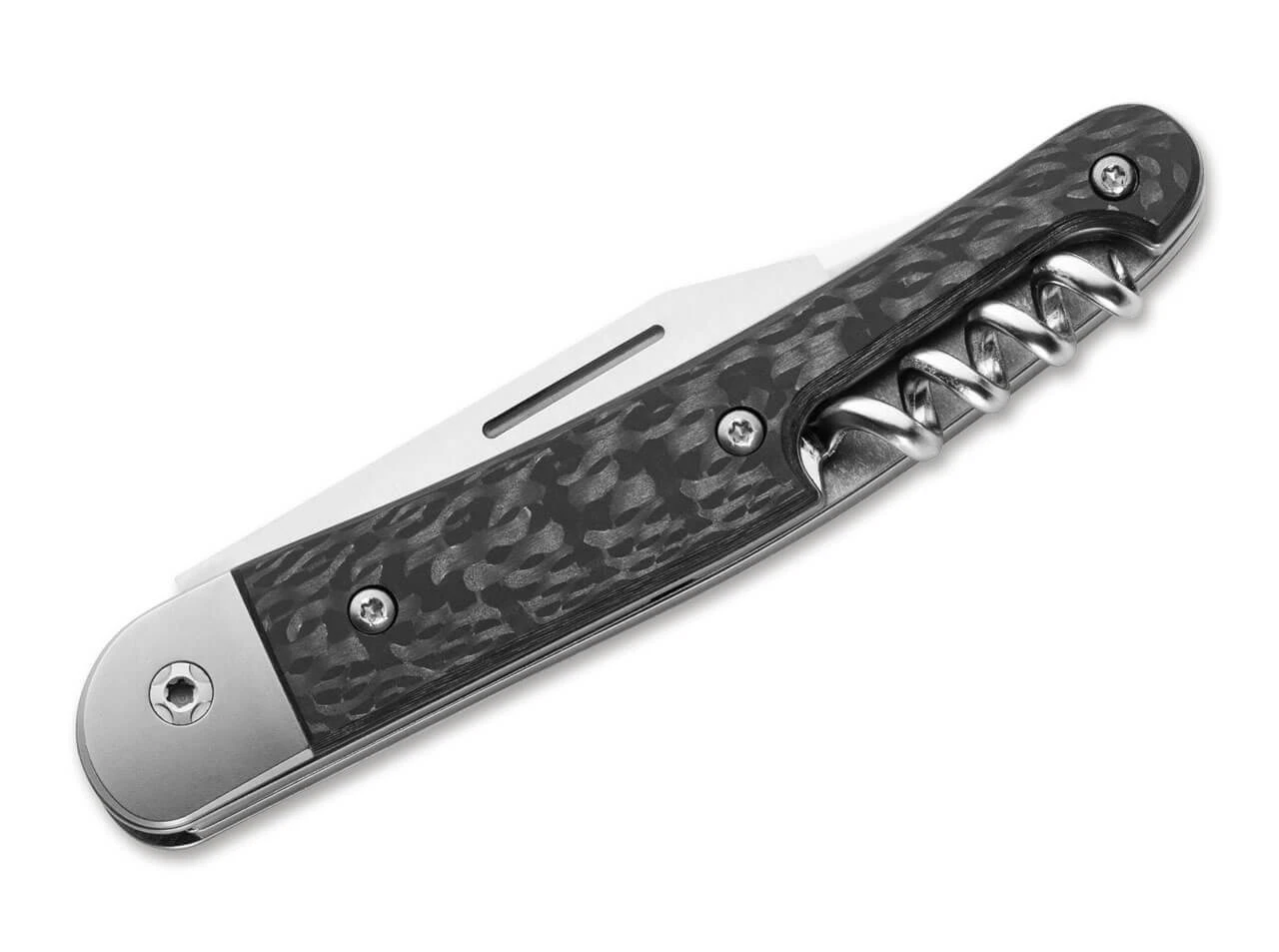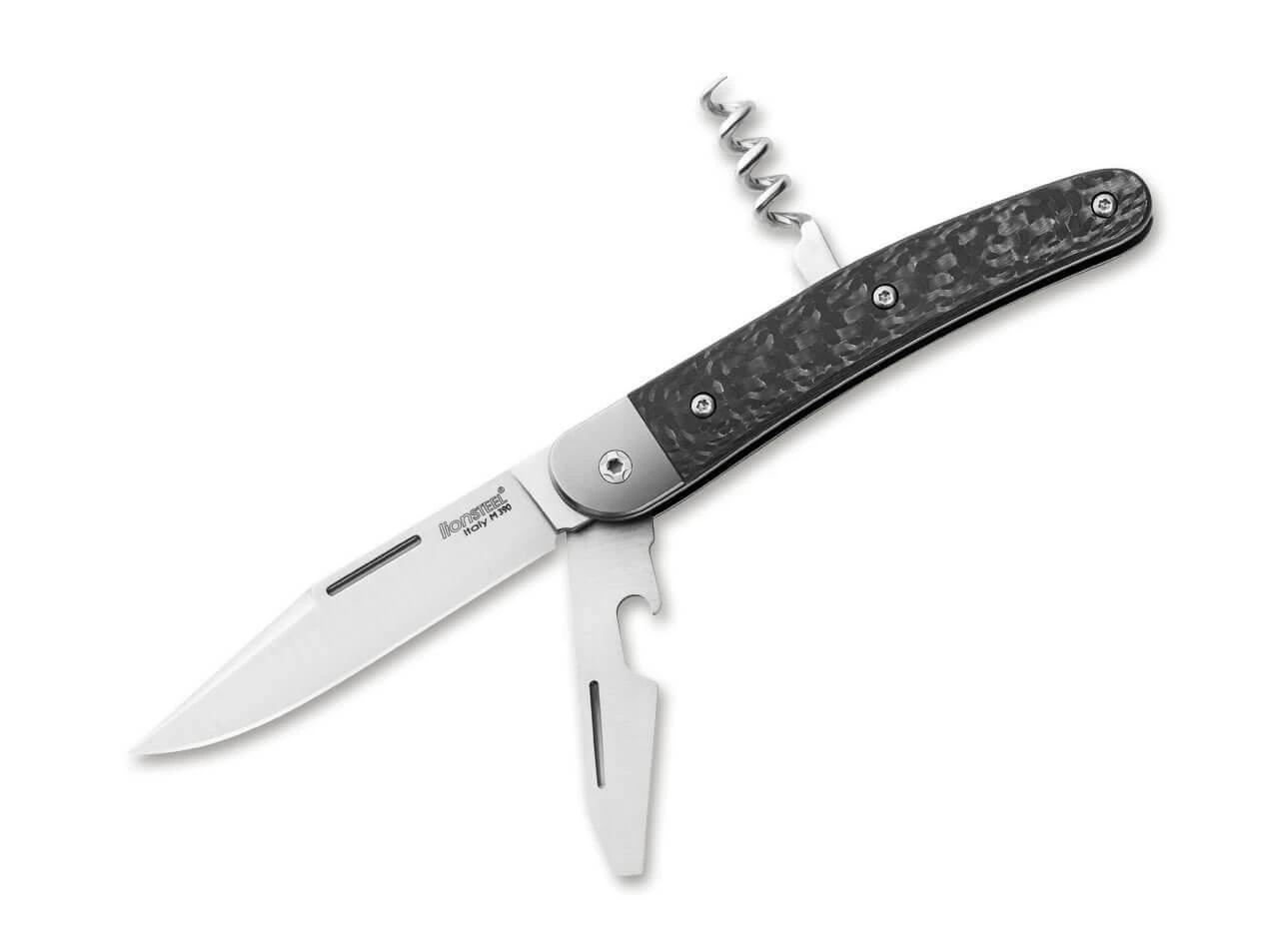 Das Jack Three ist LionSteels moderne Interpretation eines klassischen Slipjoint-Messers. Die Symbiose aus modernen Materialien mit klassischer Technik macht das Jack Three zu einem zeitlosen Alltagsmesser. Geöffnet wird die schnitthaltige Clippoint-Klinge aus M390 via Nagelhau, während der Griff aus Kohlefaser dem Messer den nötigen Halt verspricht. Die zweite Klinge enthält einen praktischen Schlitz-Schraubendreher sowie einen Kapselheber. Auch für eine gute Flasche Wein ist das Jack Three dank Korkenzieher zu haben. Liner und Backen sind aus edlem Titan gefertigt.