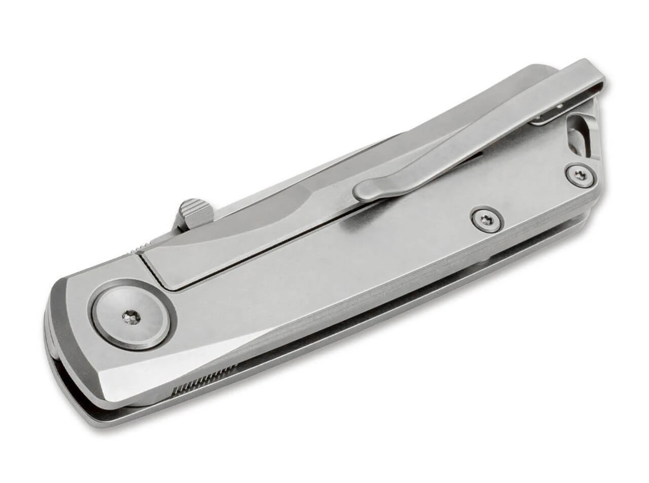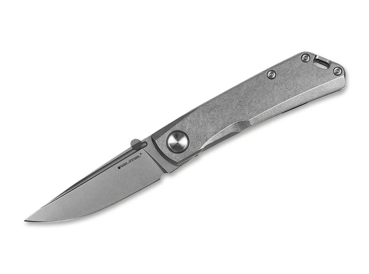 Der kleinere Bruder des Real Steel Luna Boost ist ein stabiles und ebenso elegantes EDC Messer, welches komplett aus Edelstahl besteht. Der Framelock Folder mit Böhler K110 Klinge im Stonewash-Finish öffnet wahlweise per Nagelhau oder abnehmbarem Daumenpin, während der Edelstahlgriff durch den Deep Carry Clip (Tip-up/r) und der Fangriemenöse flexible Transportmöglichkeiten bietet.