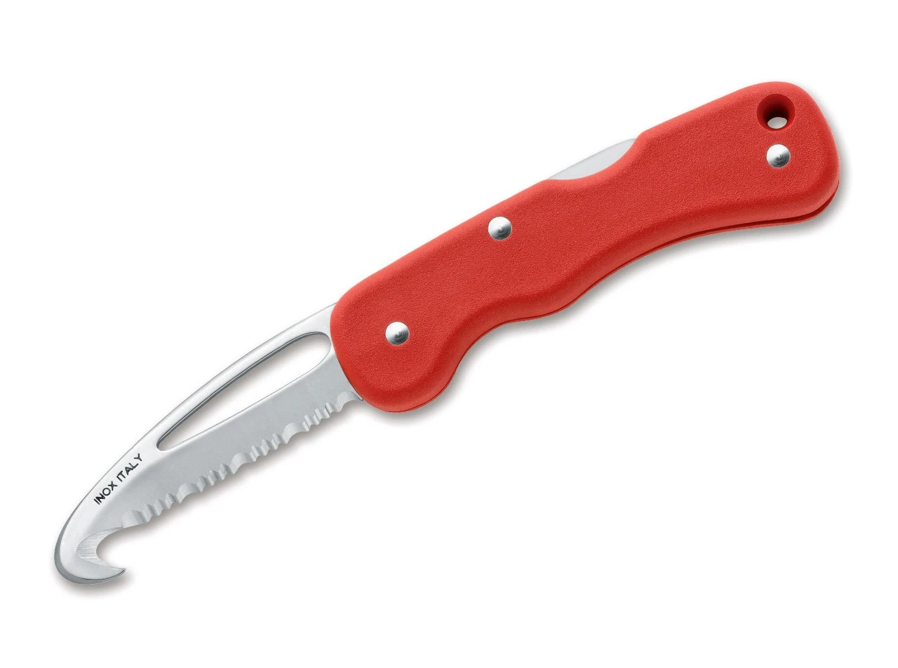 Leichtes Rettungsmesser mit roten Griffschalen und Klinge aus 4034 mit Wellenschliff, die per Daumenöffnung leicht geöffnet werden kann. Die Verriegelung übernimmt ein stabiler Backlock. Mit zusätzlichem Gurtschneider.