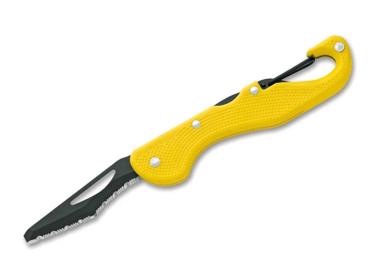 Leichtes Rettungsmesser mit gelben Griffschalen und Meißelklinge aus 4034 mit Wellenschliff.